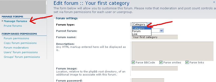 In phpBB3 there are no categories, everything is forum based. Each forum can have an unlimited number of sub-forums and you can determine whether each may be posted to or not (i.e. whether it acts like an old category). Here you can add, edit, delete, lock, unlock individual forums as well as set certain additional controls. If your posts and topics have got out of sync you can also resynchronise a forum.