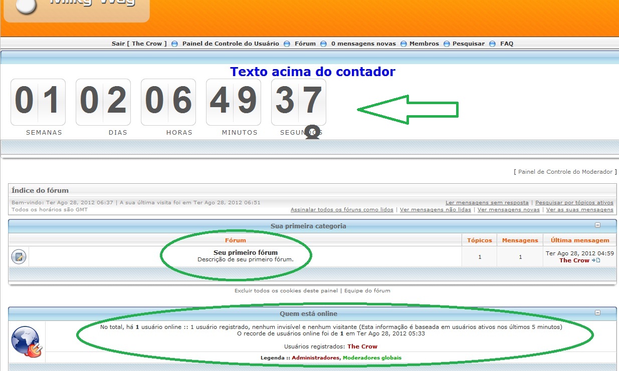 Hello friends I'm trying to put that countdown in a custom block below the banner on my forum, this is the same countdown that has the portal phpbb3bbcodes. I downloaded the file lwtCountdown-htm and sent the folders images, js and style to the root folder of the forum (on localhost), I edited the file code index.html contained in the folder and renamed to countdown.html (code below) and sent to the folder styles/ Milky_way/ template, in the file overall_header.html I added <! - INCLUDE countdown.html -> below <! - INCLUDE menu_block.html -> , this worked but the template of the forum was aligned in the center (image below).